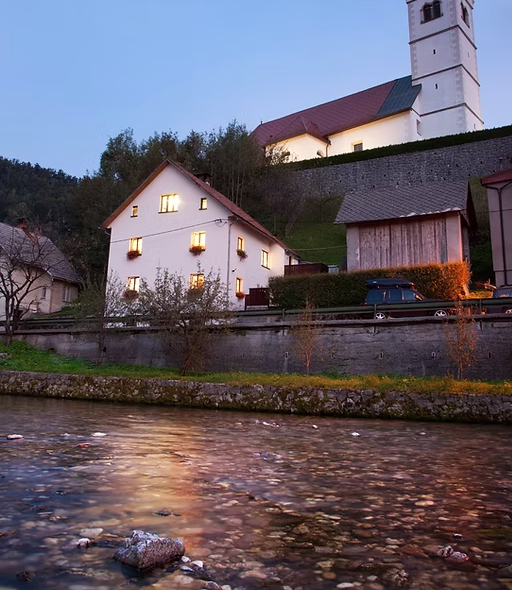Villa Sandra stoji nad kristalno Idrijco pod cerkvijo o kateri zapisi govorijo iz leta 1132.